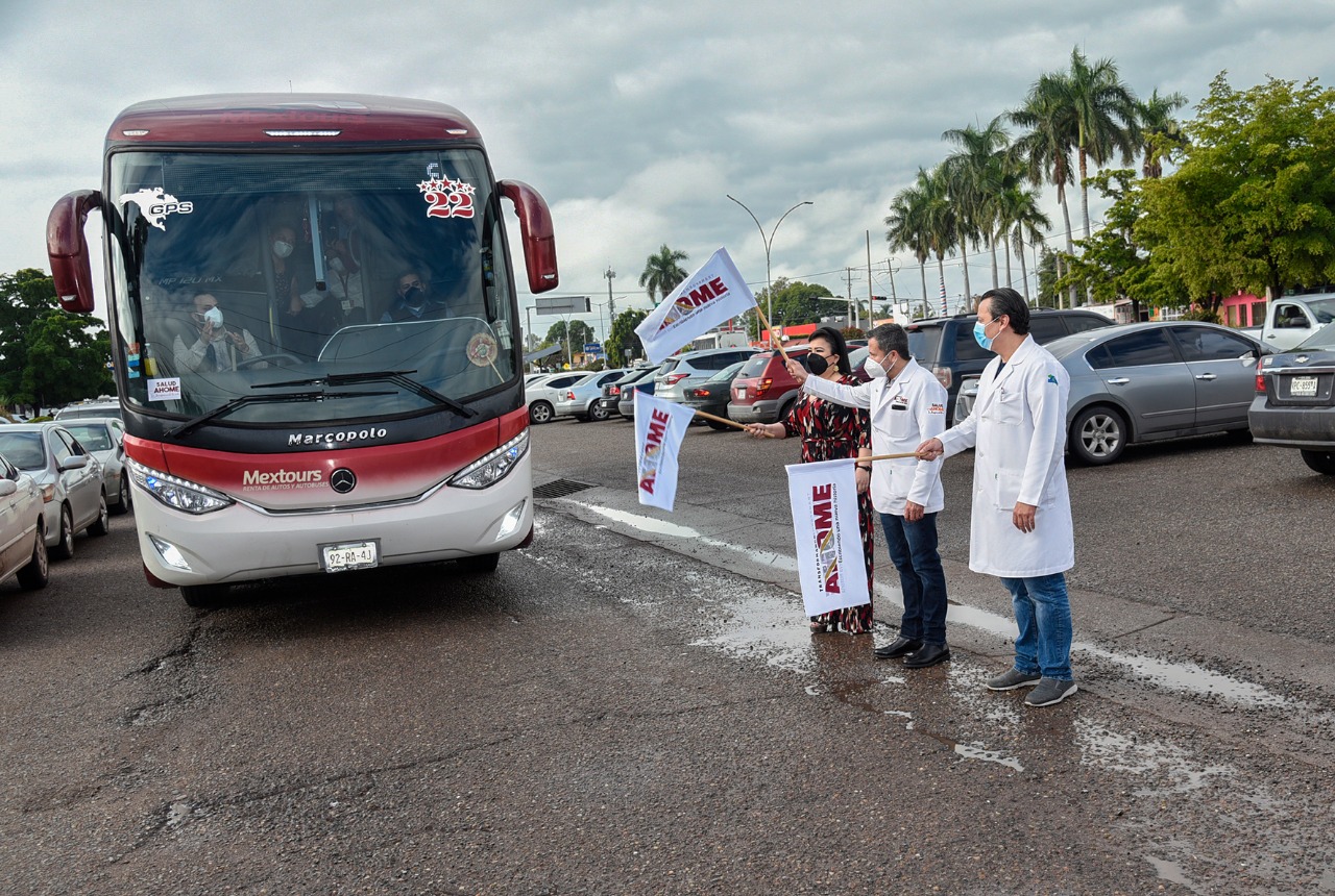 Los Mochis, Ahome, Sinaloa, 21 de enero del 2021.- La mañana de este jueves 70 trabajadores del Hospital General de Los Mochis salieron a la ciudad de Guamúchil para ser vacunados contra el Covid-19, esto con apoyo del Gobierno Municipal, quien proporcionó dos camiones, así como alimento, para que el personal médico pudiera viajar.