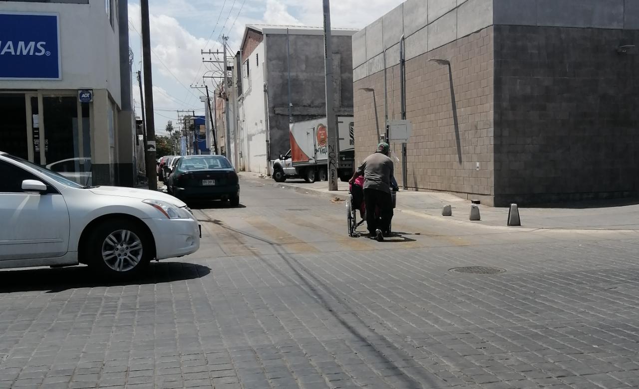 Por la calle Zaragoza y Callejón Juan Escutia se encontraba un señor de la tercera edad postrado en su silla de ruedas, mirando a los lados esperando a que dejaran de cruzar los carros para tener oportunidad de pasar de una cera a otra, sin la esperanza de que alguien lo ayudara, a pesar de las personas que miraban la escena.